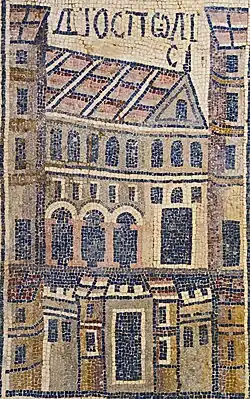 Lod has been inhabited since at least the Neolithic period.[2] It is mentioned a few times in the Hebrew Bible and in the New Testament.[3] Between the 5th century BCE and up until the late Roman period, it was a prominent center for Jewish scholarship and trade.[3][4] Around 200 CE, the city became a Roman colony and was renamed Diospolis (Ancient Greek: Διόσπολις, lit. 'city of Zeus'). Tradition identifies Lod as the 4th century martyrdom site of Saint George;[5][6] the Church of Saint George and Mosque of Al-Khadr located in the city is believed to have housed his remains.[3][7]