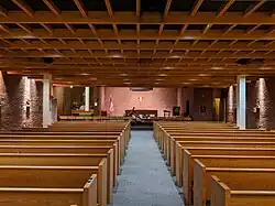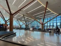 In summer 2019, Massport began another expansion project on Terminal E, due to continued growth at the airport. The project, which was completed in August 2023,[74] included the addition of 2 new international gates (E13 and E16) as well as two flexible-use international gates which can each accommodate either two narrow-body aircraft or a single wide-body aircraft (E14 and E15). The project includes all-new shops, restaurants and other passenger services which stretch into the North Cargo area. Additionally, a new TSA checkpoint was built and the ticketing, customs, and baggage claim areas were expanded. In total, the project cost $680 million and incorporated roughly 320,000 square feet (30,000 m2) of new space.[75][76] The project, inclusive of a prismatic painted roof, was designed by AECOM and luis vidal + architects, with Boston-based Suffolk Construction Company serving as construction manager.[77]