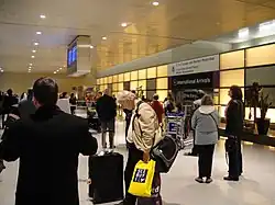 Logan International Airport has four lettered passenger terminals, A, B, C, and E, and 107 gate positions in total.[43] With the exception of flights from destinations with U.S. Customs and Border Protection preclearance, inbound international flights arrive at Terminal E for customs screening since the other terminals do not have customs screening facilities. All terminals are connected by pre-security shuttle buses and by the SL1 branch of the MBTA Silver Line BRT, and Terminals A, B, and E via pre-security moving walkways.[44] Moving walkways also connect the terminals to a central parking garage designed for consolidated service between all four terminals and the garage itself.[45] Post-security connection between Terminals B, C, and E is available.