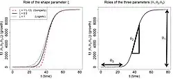 where are real numbers, and is a positive real number. The flexibility of the curve is due to the parameter : (i) if then the curve reduces to the logistic function, and (ii) as approaches zero, the curve converges to the Gompertz function. In epidemiological modeling, , , and represent the final epidemic size, infection rate, and lag phase, respectively. See the right panel for an example infection trajectory when is set to .