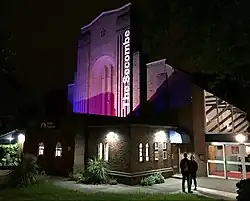The Secombe Theatre (named after Sir Harry Secombe) was in Cheam Road, adjacent to the Holiday Inn Hotel. The theatre was opened by Sir Harry, who lived in Sutton for over 30 years of his life. [30] The theatre was created out of a former Christian Scientist church building originally dating from 1937.[31][32] The main auditorium seats 396 (or 343 if the orchestra pit is in use), and there is a large multi-purpose function room attached. The Secombe Theatre is operated in conjunction with the Charles Cryer Studio Theatre, named after the man who led the campaign to open the Secombe Theatre. (The Charles Cryer Theatre is in a converted hall in nearby Carshalton – see entry above). Productions at the Secombe have ranged in content from modern productions to new twists on older, more established plays. Some productions have been produced locally, while others have come as part of touring groups. From time to time comedians and musicians have appeared at the theatre.[33]