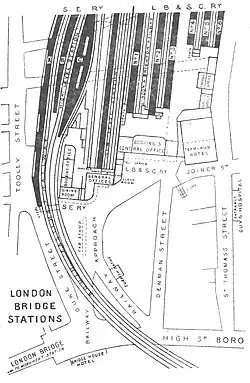 London Bridge station remained the London terminus of the SER until 1864 when its station was again rebuilt.[21] Five of the existing platforms were converted into a through station to enable the extension of the main line into central London and the opening of Charing Cross railway station, and in 1866 to Cannon Street station.[24] In 1899 the SER entered into a working amalgamation with the London Chatham and Dover Railway (LC&DR) to form the South Eastern and Chatham Railway Companies Joint Management Committee. Junctions were laid to enable trains through London Bridge to reach the LC&DR stations at Holborn Viaduct and St Pauls.[25]
