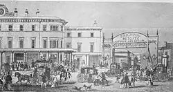 London Bridge station was opened on 14 December 1836, making it the oldest London railway terminus that is still running.[7] It was not the earliest station in the London metropolitan area, as the London and Greenwich Railway had opened stations at Spa Road (in Bermondsey) and Deptford on 8 February 1836. The completion of the line into London Bridge was postponed because of delays in constructing a bridge at Bermondsey Street. From 10 October 1836, trains were able to operate as far as the east end of this bridge, with passengers having to walk the last 300 yards (270 m).[8] The station has had several changes of ownership and complete rebuilds since opening.[7]