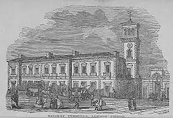Plans for a large new station were drawn up, designed jointly by Lewis Cubitt, John Urpeth Rastrick and Henry Roberts.[15] Drawings were published in the Illustrated London News and George Bradshaw's Guide to the London and Brighton Railway 1844. They show 'a quasi-Italianate building with a picturesque campanile'.[16] It opened for business in July 1844 while only partially complete, but events were taking place which would mean that the bell tower would never be built, and the new building would only last five years.[17]