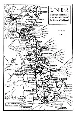 The LNER inherited four of London's termini: Fenchurch Street (ex-London and Blackwall Railway;[5] King's Cross (ex-Great Northern Railway); Liverpool Street (ex-Great Eastern Railway); and Marylebone (ex-Great Central Railway).[6] In addition, it ran suburban services to Broad Street (London, Midland and Scottish Railway) and Moorgate (Metropolitan Railway, later London Transport).[7]