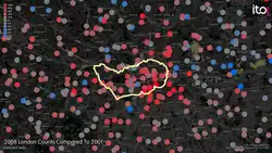 In August 2004, following Livingstone's re-election, the results of the consultation on the Western Extension were published which showed that a substantial majority of respondents did not want the extension;[101] however, Livingstone said he was going ahead and that the polls were a "charade" which did not diminish his electoral mandate. "A consultation is not a referendum" he said.[102] Protests continued against the extension,[103] with residents arguing that only 5% of the road space in the selected area was congested.[104] Following on in May 2005 a further TfL consultation began with specific proposals about the extensions. These included a plan to reduce the operating hours of the charge by half-an-hour to "boost trade at London's theatres, restaurants and cinemas".[105][106]
