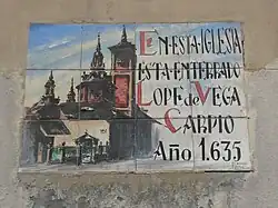 Lope de Vega Carpio[6] was born November 1562 in Madrid, in the Puerta de Guadalajara to a family of natives of the valley of Carriedo.[7] His father, Félix de Vega, was an embroiderer. Little is known of his mother, Francisca Fernández Flores. He later took the distinguished surname of Carpio from his paternal grandmother, Catalina del Carpio.