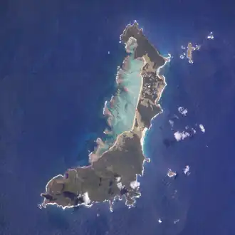 Lord Howe Island (/h/; formerly Lord Howe's Island) is an irregularly crescent-shaped volcanic remnant in the Tasman Sea between Australia and New Zealand, part of the Australian state of New South Wales. It lies 600 km (370 mi; 320 nmi) directly east of mainland Port Macquarie, 780 km (480 mi; 420 nmi) northeast of Sydney, and about 900 km (560 mi; 490 nmi) southwest of Norfolk Island. It is about 10 km (6.2 mi) long and between 0.3 and 2.0 km (0.19 and 1.24 mi) wide with an area of 14.55 km2 (3,600 acres), though just 3.98 km2 (980 acres) of that comprise the low-lying developed part of the island.[5] The island is named after Richard Howe, 1st Earl Howe.[6] Along the west coast is a sandy semi-enclosed sheltered coral reef lagoon. Most of the population lives in the north, while the south is dominated by forested hills rising to the highest point on the island, Mount Gower (875 m, 2,871 ft).[7] The Lord Howe Island Group[7] comprises 28 islands, islets, and rocks. Apart from Lord Howe Island itself, the most notable of these is the volcanic and uninhabited Ball's Pyramid about 23 km (14 mi; 12 nmi) to the southeast of Howe. To the north lies the Admiralty Group, a cluster of seven uninhabited islets.[8]