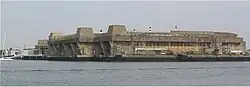 In 1943–1944, Lorient was nearly razed to the ground by Allied bombing, which failed to destroy the submarine pens despite 4,000 tons of bombs dropped.[19] According to the book Steel Boats, Iron Hearts (by former U-505 crewman Hans Goebeler), after the Allies failed to damage the U-boat bunkers the bombing shifted to the city itself to deny the Germans workers and other resources. Before the bombings, thousands of leaflets were dropped on the population instructing the inhabitants to evacuate.[20] Between 14 January 1943 and 17 February 1943, as many as 500 high-explosive aerial bombs and more than 60,000 incendiary bombs were dropped on Lorient.