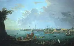 In 1769, the city evolved into a full-scale naval base for the Royal Navy when Louis XV bought out the Company's infrastructures for 17,500,000 livres tournois.[11] From 1775 on, the American Revolutionary War brought a surge in activity, as many privateers hailed from Lorient. When the war ended, transatlantic lines opened to the United States, and in 1785, a new commercial company started under Calonne's tutelage (then Controller-General of Finances) with the same goal as the previous entities, i.e. conducting trade in India and China, with again Lorient standing as its operative base.[13]
