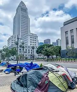 In June 2025, the city experienced protests and riots following raids by Immigration and Customs Enforcement (ICE).[86] Los Angeles is being targeted by the Trump administration over its sanctuary city status sending in hundred of federal agents to target the immigrant community of the city.[87] Trump sent in the Army National Guard and US Marines without the consent of local governments.[88]