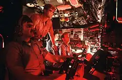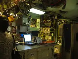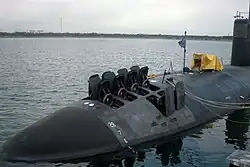 Two watertight compartments are used in the Los Angeles-class submarines. The forward compartment contains crew living spaces, weapons-handling spaces, and control spaces not critical to recovering propulsion. The aft compartment contains the bulk of the submarine's engineering systems, power generation turbines, and water-making equipment.[27] Some submarines in the class are capable of delivering Navy SEALs through either a SEAL Delivery Vehicle deployed from the Dry Deck Shelter or the Advanced SEAL Delivery System mounted on the dorsal side, although the latter was cancelled in 2006 and removed from service in 2009.[28] A variety of atmospheric control devices are used to allow the vessel to remain submerged for long periods of time without ventilating, including an electrolytic oxygen generator, which produces oxygen for the crew and hydrogen as a byproduct. The hydrogen is pumped overboard but there is always a risk of fire or explosion from this process.[1][29]