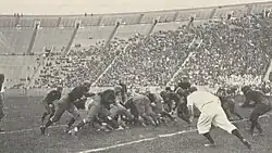 The Coliseum was commissioned as a memorial to L.A. veterans of World War I (rededicated to all United States veterans of the war in 1968).[36] The groundbreaking ceremony took place on December 21, 1921, with construction being completed in just over 16 months, on May 1, 1923.[37] Designed by John and Donald Parkinson, the original bowl's initial construction costs were $954,873. When the Coliseum opened in 1923, it was the largest stadium in Los Angeles, with a capacity of 75,144. In 1930, however, with the Olympics due in two years, the stadium was extended upward to seventy-nine rows of seats with two tiers of tunnels, expanding the seating capacity to 101,574. The physical structure of a bowl-shaped configuration for the Coliseum was undoubtedly inspired by the earlier Yale Bowl which was built in 1914. The now-signature Olympic torch was added, and the stadium was briefly known as Olympic Stadium. The Olympic cauldron torch which burned through both Games remains above the peristyle at the east end of the stadium as a reminder of this, as do the Olympic rings symbols over one of the main entrances. Originally for the 1984 games, burnable Olympic Rings and a 25-step hydraulic staircase were added inside in the front of the coliseum to allow the cauldron to be lit by lifting up the stairs to the burnable Olympic Rings, which brought the flame to the cauldron on top.[38] The football field runs east to west with the press box on the south side of the stadium.