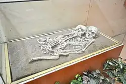 The people of Lothal worshipped a fire god who is speculated to be the horned deity depicted on seals. The presence of private and public fire-altars where religious ceremonies were hosted further testifies to their spiritual beliefs. Archaeologists have discovered gold pendants, charred ashes of terra-cotta cakes and pottery, bovine remains, beads and other signs that may indicate the practice of the Gavamayana sacrifice, associated with the ancient Vedic religion.[29] Animal worship is also evidenced, but not the worship of the Mother Goddess that is evidenced in other Harappan cities—experts consider this a sign of the existence of diversity in religious traditions. However, it is believed that a sea goddess, perhaps cognate with the general Indus-era Mother Goddess, was worshipped. Today, the local villagers likewise worship a sea goddess, Vanuvati Sikotarimata, suggesting a connection with the ancient port's traditions and historical past as an access to the sea.[30][31] But the archaeologists also discovered that the practice had been given up by 2000 BCE (determined by the difference in burial times of the carbon-dated remains). It is suggested that the practice occurred only on occasion. It is also considered that given the small number of graves discovered—only 17 in an estimated population of 15,000—the citizens of Lothal also practised cremation of the dead. Post-cremation burials have been noted in other Indus sites like Harappa, Mehi and Damb-Bhuti.[32]