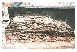 Facilitating the movement of cargo was a mudbrick wharf, 220 metres (720 feet) long, built on the western arm of the dock, with a ramp leading to the warehouse and acropolis, built on a packed mud platform, original 4.26 metres (14.0 feet) in height (Now it is 3.35 metres or 11.0 feet.) on the south western flank of the basin.[47] The warehouse was originally built on sixty-four cubical blocks, 3.6 metres (12 feet) square, with 1.2-metre (3.9-foot) passages, and based on a 3.5-metre (11-foot) mud-brick podium. The pedestal was very high to provide maximum protection from floods. Brick-paved passages between blocks served as vents, and a direct ramp led to the dock to facilitate loading. The warehouse was located close to the acropolis, to allow tight supervision by ruling authorities. Despite elaborate precautions, the major floods that brought the city's decline destroyed all but twelve blocks, which became the makeshift storehouse.[48]