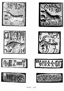The discovery of etched carnelian beads and non-etched barrel beads in Kish and Ur (modern Iraq), Jalalabad (Afghanistan) and Susa (Iran) attest to the popularity of the Indus bead industry across West Asia.[37] The lapidaries select stones of variegated colours, producing beads of different shapes and sizes. The methods of Lothal bead-makers were so advanced that no improvements have been noted over 4,000 years—modern makers in the Khambhat area follow the same technique. Double-eye beads of agate and collared or gold-capped beads of jasper and carnelian beads are among those attributed as uniquely from Lothal. It was very famous for micro-cylindrical beads of steatite (chlorite).[36] The Lothal excavation yielded 213 seals, third in volume amongst all Indus sites. Seal-cutters preferred short-horned bulls, mountain goats, tigers and composite animals like the elephant-bull for engravings. There is a short inscription of intaglio in almost every seal. Stamp seals with inserted copper rings in a perforated button were used to seal the cargo with impressions of packing materials like mats, twisted cloth, and cords. These seals were only verified at Lothal. Quantitative descriptions along with seals of rulers and owners were stamped on goods. A unique seal found here is from Bahrain—circular, with motif of a dragon flanked by jumping gazelles.[38]