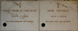After a funeral Mass at his Catholic parish, St. Francis de Sales in Sherman Oaks,[24] Costello was interred at the Calvary Cemetery in East Los Angeles on March 8.[25] His wife Anne died from an apparent heart attack nine months later on December 5, 1959, at age 47.[26][27]
