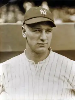 Gehrig joined the New York Yankees midway through the 1923 season and made his major-league debut as a pinch hitter at age 19 on June 15, 1923. In his first two seasons, Gehrig was mired behind Yankee stalwart Wally Pipp at first base, a two-time American League (AL) home run champion and one of the premier power hitters in Major League Baseball's (MLB) "dead-ball era."[28] Gehrig saw limited playing time, mostly as a pinch hitter, playing in only 23 games and being left off the Yankees' 1923 World Series roster in spite of producing both years (with lofty batting averages of .423 in 1923 and .500 in 1924). On June 1, 1925, the slumping Pipp took himself out of the day's lineup with complaints of a headache and was replaced by Gehrig. Pipp would never get his job with the team back, while Gehrig went on to appear in every game the Yankees played until April 30, 1939.[29] In 1925, Gehrig batted .295, with 20 home runs and 68 runs batted in (RBIs) over 126 games.[24]