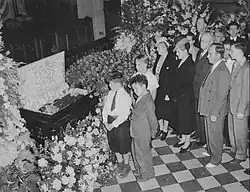 Staff at the Mayo Clinic released their ALS diagnosis to the public on June 19, 1939. Two days later, the Yankees announced Gehrig's retirement, with an immediate public push to honor him.[66] In its coverage the following day, The New York Times wrote that the ceremony was "perhaps as colorful and dramatic a pageant as ever was enacted on a baseball field [as] 61,808 fans thundered a hail and farewell."[67] Dignitaries and members of the Murderers' Row lineup attended the ceremonies and praised Gehrig. New York mayor Fiorello La Guardia called Gehrig the "perfect prototype of the best sportsmanship and citizenship," and James Farley (who was concurrently the United States Postmaster General, chair of the Democratic National Committee and chair of the New York Democratic Party) concluded his speech by predicting, "Your name will live long in baseball and wherever the game is played they will point with pride and satisfaction to your record."[66]