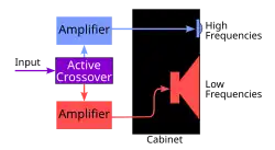 An active crossover is an electronic filter circuit that divides the signal into individual frequency bands before power amplification, thus requiring at least one power amplifier for each band. Passive filtering may also be used in this way before power amplification, but it is an uncommon solution, being less flexible than active filtering. Any technique that uses crossover filtering followed by amplification is commonly known as bi-amping, tri-amping, quad-amping, and so on, depending on the minimum number of amplifier channels.[32]