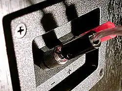 Most home hi-fi loudspeakers use two wiring points to connect to the source of the signal (for example, to the audio amplifier or receiver). To accept the wire connection, the loudspeaker enclosure may have binding posts, spring clips, or a panel-mount jack. If the wires for a pair of speakers are not connected with respect to the proper electrical polarity,[b] the loudspeakers are said to be out of phase or more properly out of polarity.[38][39] Given identical signals, motion in the cone of an out of polarity loudspeaker is in the opposite direction of the others. This typically causes monophonic material in a stereo recording to be canceled out, reduced in level, and made more difficult to localize, all due to destructive interference of the sound waves. The cancellation effect is most noticeable at frequencies where the loudspeakers are separated by a quarter wavelength or less; low frequencies are affected the most. This type of miswiring error does not damage speakers, but is not optimal for listening.[40][41]