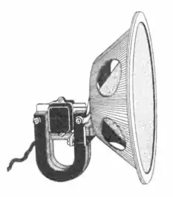 Johann Philipp Reis installed an electric loudspeaker in his telephone in 1861; it was capable of reproducing clear tones, but later revisions could also reproduce muffled speech.[3] Alexander Graham Bell patented his first electric loudspeaker (a moving iron type capable of reproducing intelligible speech) as part of his telephone in 1876, which was followed in 1877 by an improved version from Ernst Siemens. During this time, Thomas Edison was issued a British patent for a system using compressed air as an amplifying mechanism for his early cylinder phonographs, but he ultimately settled for the familiar metal horn driven by a membrane attached to the stylus. In 1898, Horace Short patented a design for a loudspeaker driven by compressed air; he then sold the rights to Charles Parsons, who was issued several additional British patents before 1910. A few companies, including the Victor Talking Machine Company and Pathé, produced record players using compressed-air loudspeakers. Compressed-air designs are significantly limited by their poor sound quality and their inability to reproduce sound at low volume. Variants of the design were used for public address applications, and more recently, other variations have been used to test space-equipment resistance to the very loud sound and vibration levels that the launching of rockets produces.[4]