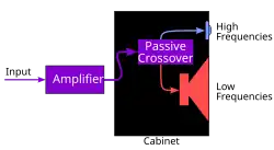 Some loudspeaker designs use a combination of passive and active crossover filtering, such as a passive crossover between the mid- and high-frequency drivers and an active crossover for the low-frequency driver.[33][34]