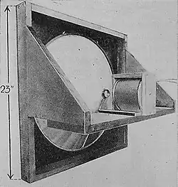 In the 1930s, loudspeaker manufacturers began to combine two and three drivers or sets of drivers each optimized for a different frequency range in order to improve frequency response and increase sound pressure level.[10] In 1937, the first film industry-standard loudspeaker system, "The Shearer Horn System for Theatres",[11] a two-way system, was introduced by Metro-Goldwyn-Mayer. It used four 15" low-frequency drivers, a crossover network set for 375 Hz, and a single multi-cellular horn with two compression drivers providing the high frequencies. John Kenneth Hilliard, James Bullough Lansing, and Douglas Shearer all played roles in creating the system. At the 1939 New York World's Fair, a very large two-way public address system was mounted on a tower at Flushing Meadows. The eight 27" low-frequency drivers were designed by Rudy Bozak in his role as chief engineer for Cinaudagraph. High-frequency drivers were likely made by Western Electric.[12]
