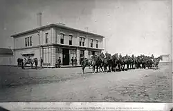 The settlement now faced a possible threat, from cross-border Fenian raids coordinated by his former associate William Bernard O'Donoghue.[41] Archibald issued a call to arms in October, and assured Riel that if he participated he would not be arrested. Riel organized several companies of Métis troops for the defence of Manitoba. When Archibald reviewed the troops in St. Boniface, he made the significant gesture of publicly shaking Riel's hand, signalling that a rapprochement had been effected.[42][41][6]