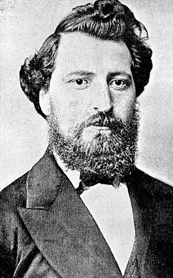 Following news of his father's premature death in 1864, Riel lost interest in the priesthood and withdrew from the college in March 1865. For a time, he continued his studies as a day student in the convent of the Grey Nuns, but was soon asked to leave, following breaches of discipline.[12] During Riel's period of mourning of his father, he believed that Louis Riel was dead and he himself was David Mordecai, a Jew from Marseilles, and as David, he was not eligible to the immense inheritance of his father (which, in fact, was of little value). Seized with religious fervour, he announced that he was going to form a new religious movement.[14] He remained in Montreal for over a year, living at the home of his aunt, Lucie Riel. Impoverished by the death of his father, Riel took employment as a law clerk in the Montreal office of Rodolphe Laflamme.[6][15] During this time he was involved in a failed romance with a young woman named Marie-Julie Guernon. This progressed to the point of Riel having signed a contract of marriage, but his fiancée's family opposed her involvement with a Métis, and the engagement was soon broken. Compounding this disappointment, Riel found legal work unpleasant and, by early 1866, he had resolved to leave Canada East.[12][16][17] Some of his friends said later that he worked odd jobs in Chicago, while staying with poet Louis-Honoré Fréchette,[18] and wrote poems himself in the manner of Lamartine, and that he was briefly employed as a clerk in Saint Paul, Minnesota, before returning to the Red River settlement on 26 July 1868.[19]