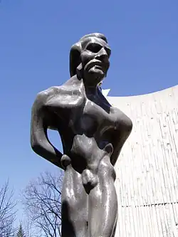 Two statues of Riel are located in Winnipeg. One of these statues, the work of architect Étienne Gaboury and sculptor Marcien Lemay, depicts Riel as a naked and tortured figure. It was unveiled in 1971 and stood in the grounds of the Manitoba Legislative Building for 23 years. After much outcry (especially from the Métis community) that the statue was an undignified misrepresentation, the statue was removed and placed at the Université de Saint-Boniface.[105][106] It was replaced with a statue of Riel designed by Miguel Joyal depicting Riel as a dignified statesman. The unveiling ceremony was on 12 May 1996, in Winnipeg.[107][106] A statue of Riel on the grounds of the Saskatchewan Legislative Building in Regina was installed and later removed for similar reasons.[108]