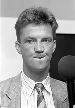 Van Gaal was born in Amsterdam.[2] As a youngster, he started playing for the Amsterdam amateur side RKSV de Meer. At the age of 20, he joined the second team of Ajax, but was never chosen to play in the first team, which at the time boasted players such as Johan Cruyff and Johan Neeskens in the midfield positions. He was loaned to Belgian First Division side Royal Antwerp playing under Guy Thys with whom he was runner-up in the Belgian top division in 1974 and 1975. During his time with Antwerp, Van Gaal suffered a broken nose in a friendly against Kortrijk.[11] After four years spent in Belgium, he returned to his homeland and made his Eredivisie debut for Telstar under the guidance of manager, Mircea Petescu, whom he followed to Sparta Rotterdam. He later joined AZ, where he also became assistant coach in 1986. After a short career at AZ, he returned to Ajax to become Leo Beenhakker's assistant. When Beenhakker left in 1991, Van Gaal took over as manager.[12]