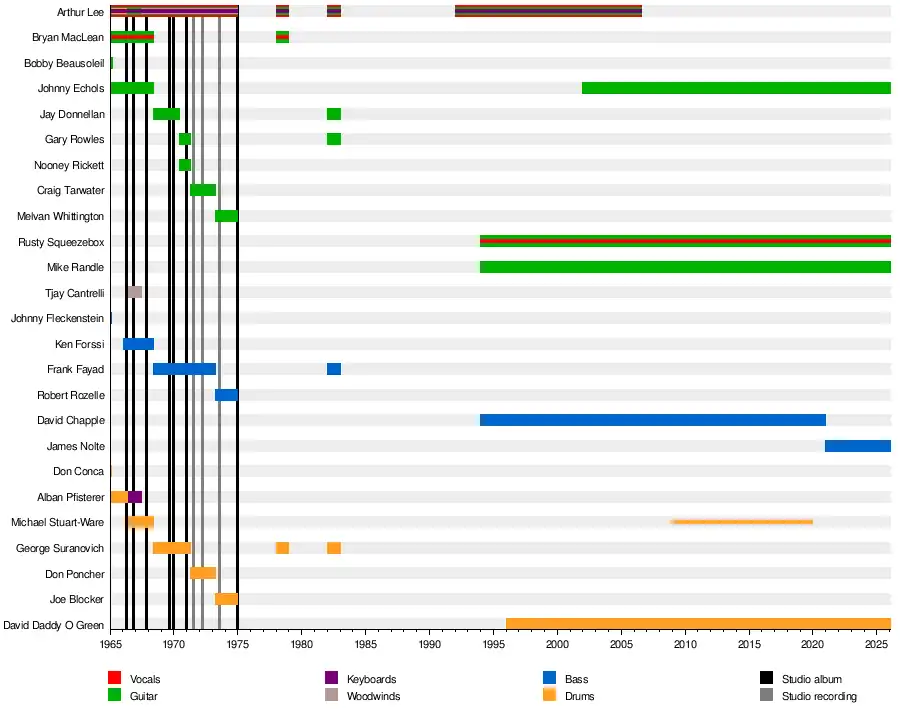 - Arthur Lee – songwriter, vocals, guitar, piano, percussion, harmonica (1965–75, 1978, 1982, 1992–2006; his death)