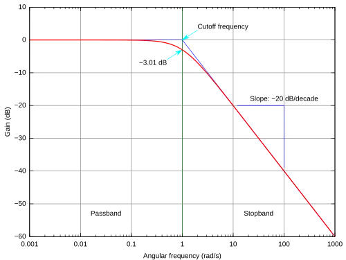 The gain-magnitude frequency response of a first-order (one-pole) low-pass filter. Power gain is shown in decibels (i.e., a 3 dB decline reflects an additional attenuation). Angular frequency is shown on a logarithmic scale in units of radians per second.
