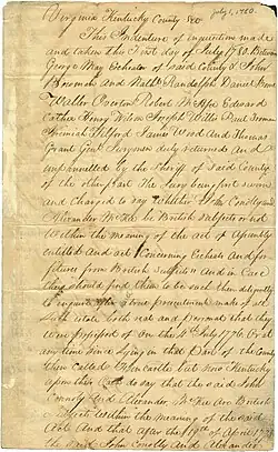 A jury finding from Kentucky County, Virginia in July 1780, confiscating lands of two men adjudged to be British subjects. Daniel Boone was listed as a member of the jury.