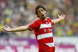 In the 2008–09 season, Toni maintained his high-standard of form for Bayern. In the Bundesliga, he started 13 games from January, in which he scored nine goals, a notable one being a late stoppage-time winner he scored against TSG Hoffenheim.[12] In the 2008–09 UEFA Champions League, he scored a goal in a 3–0 win over Steaua București in the group stages,[13] then a brace in a 5–0 away win over Sporting CP in the round of 16.[14]