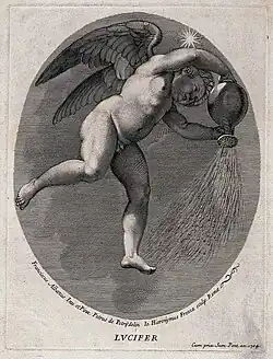 In Roman folklore, Lucifer ("light-bringer" in Latin) was the name of the planet Venus, though it was often personified as a male figure bearing a torch. The Greek name for this planet was variously Phosphoros Φωσφόρος (also meaning "light-bringer") or Heosphoros/Eosphoros Ἑωσφόρος (meaning "dawn-bringer").[2] Lucifer was said to be "the fabled son of Aurora[3][4] and Cephalus, and father of Ceyx". He was often presented in poetry as heralding the dawn.[2]