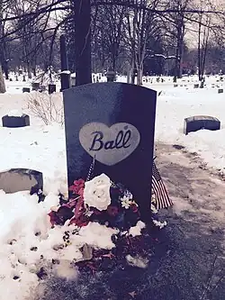Three memorial services were held for Ball.[111][112] She was cremated, and the ashes were originally interred at Forest Lawn – Hollywood Hills Cemetery in Los Angeles, where her mother was also buried. In 2002, Ball's and her mother's remains were re-interred at the Hunt family plot at Lake View Cemetery in Jamestown, New York, in accordance with Ball's wishes to be buried near her mother.[113]
