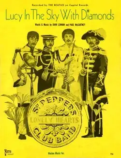 "Lucy in the Sky with Diamonds" is a song by the English rock band the Beatles from their 1967 album Sgt. Pepper's Lonely Hearts Club Band. It was written primarily by John Lennon with assistance from Paul McCartney, and credited to the Lennon–McCartney songwriting partnership.[2] Lennon's son Julian inspired the song with a nursery school drawing that he called "Lucy – in the sky with diamonds". Shortly before the album's release, speculation arose that the first letter of each of the nouns in the title intentionally spelled "LSD", the initialism commonly used for the hallucinogenic drug lysergic acid diethylamide.[3] Lennon repeatedly denied that he had intended it as a drug song,[3][4] and attributed the song's fantastical imagery to his reading of Lewis Carroll's Alice in Wonderland books.[3]