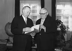 ^Due to the division of Germany, Ludwig Erhard was Federal Chancellor in West Germany. The term West Germany is only the common English name for the Federal Republic of Germany between its formation on 23 May 1949 and the German reunification through the accession of East Germany on 3 October 1990. The office of chancellor never existed in East Germany.