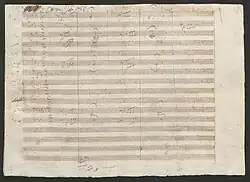 Beethoven's return to Vienna from Heiligenstadt was marked by a change in musical style, and is now often designated as the start of his middle or "heroic" period, characterised by many original works composed on a grand scale.[74] According to Czerny, Beethoven said: "I am not satisfied with the work I have done so far. From now on I intend to take a new way."[75] An early major work employing this new style was the Third Symphony in E♭, Op. 55, known as the Eroica, written in 1803–04. The idea of creating a symphony based on the career of Napoleon may have been suggested to Beethoven by General Bernadotte in 1798.[76] Sympathetic to the ideal of the heroic revolutionary leader, Beethoven originally gave the symphony the title "Bonaparte", but disillusioned by Napoleon declaring himself Emperor in 1804, he scratched Napoleon's name from the manuscript's title page, and the symphony was published in 1806 with its present title and the subtitle "to celebrate the memory of a great man".[77] The Eroica was longer and larger in scope than any previous symphony. When it premiered in early 1805 it received a mixed reception. Some listeners objected to its length or disliked its structure, while others viewed it as a masterpiece.[78]