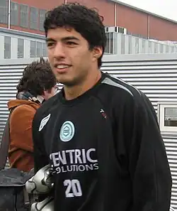 Suárez was 19 years old when he joined Groningen. Initially, Suárez struggled because he could not speak Dutch or English, and he played on the second team to adjust to the Dutch game.[27] His teammate and fellow Uruguayan, Bruno Silva, and his teammate Rùfson, helped him settle into living in the Netherlands and playing for a new team.[27] He worked hard to learn Dutch and his teammates respected him for his efforts with the language.[27] Suárez scored goals for Groningen, but he also had disciplinary problems; in one five-game stretch in January 2007, he scored four goals but received three yellow cards and one red card.[28] Suárez especially made his mark in a 4–3 home win over Vitesse, when with ten minutes to go he subsequently won a penalty and scored two goals.[29] Suárez ended with 10 goals in 29 league appearances[30] to help Groningen finish eighth in the 2006–07 Eredivisie.[27] He also scored in a 4–2 loss to Serbian club Partizan in his European debut on 14 September 2006.[27][31]