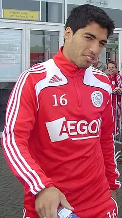 On 9 August 2007 Suárez signed a five-year contract with Ajax, for a transfer fee of €7.5 million,[32][34] and made his club debut in a UEFA Champions League qualifier against Slavia Prague.[35] He scored one goal in his Eredivisie debut for the club[36] and two goals in his home debut at the Amsterdam Arena.[37] Ajax finished second in the league table in the 2007–08 season[38] and Suárez scored 17 goals in 33 league appearances, setting up a blossoming striking partnership with league top scorer Klaas-Jan Huntelaar.[39]