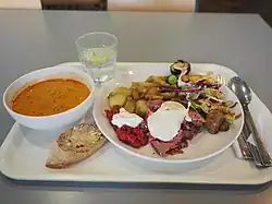 - ^ "Traditionally, lunch would be the main meal of the day. In the domestic arena, modern working practices have changed this considerably, although many restaurants still tout lunchtime dishes or a fixed lunch menu Gedeck or Tagesmenü."[17]