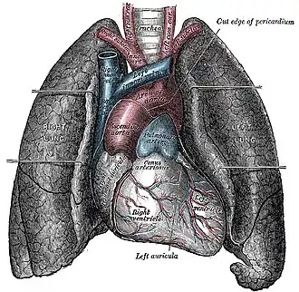 The left lung shares space with the heart, and has an indentation in its border called the cardiac notch of the left lung to accommodate this.[2][3] The front and outer sides of the lungs face the ribs, which make light indentations on their surfaces. The medial surfaces of the lungs face towards the centre of the chest, and lie against the heart, great vessels, and the carina where the trachea divides into the two main bronchi.[3] The cardiac impression is an indentation formed on the surfaces of the lungs where they rest against the heart.