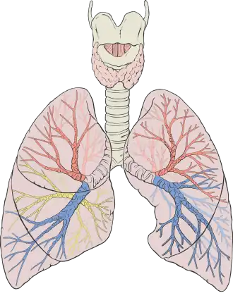 ![]() Diagram of the human lungs with the respiratory tract visible, and different colours for each lobe | |