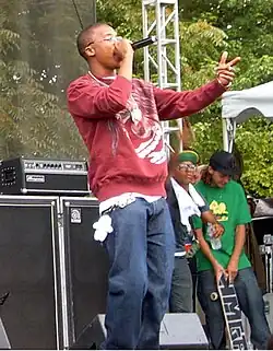 In sixth grade, he went to live with his father full-time in Harvey, Illinois.[11] His father lived next door to a crack house and taught Fiasco to use guns to defend himself from drug dealers.[3] Despite his unstable upbringing, Fiasco states that he was well-educated as a child, asserting that his parents exposed him to a diverse array of subjects and that reading was highly encouraged in his household.[3] As a teenager, Fiasco participated in Academic Decathlon competitions.[5] His mother described him by saying, "He was a great spirited child. Smart, a bit complex; he kind of was a loner; he didn't hang with a lot of people...He always had the glasses. Always had a book bag over his shoulder and some type of a writing tablet."[5] Fiasco initially disliked hip hop music for its use of vulgarity, and preferred to listen to jazz; he idolized clarinet player Benny Goodman.[3][9] His struggle to learn to play an instrument led him to create poetry instead, which led to his interest in the lyrical aspects of music.[12]