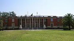 Under Adshead's original plans, Lusaka was proposed as a pure administrative centre, with no industry or large African population; he commented at one point that it "could never become an important city".[13][40] Under Bowling's revised plans, there were areas designated for both light and heavy industry, as well as a business area.[13][41] He gave prominence to the airport, as well as to the government house, albeit under a simpler design than that envisaged by Storrs. Both men had built racial segregation into their plans, dividing the city into "native" and "non-native" areas, with residential areas and services for Africans placed on the southern periphery of the city. Despite producing these plans, both Adshead and Bowling had left Rhodesia before the Lusaka week, and the remainder of the building was left to Dutton and a small team of white officials.[41] The city's footprint covered a large area, even at this early stage, despite much of it being undeveloped. This was part of a policy devised by Adshead intended to allow internal expansion, rather than the usual central core with suburbs added outside.[42][43]