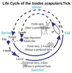 Lyme disease is classified as a zoonosis, as it is transmitted to humans from a natural reservoir among small mammals and birds by ticks that feed on both sets of hosts.[69] Hard-bodied ticks of the genus Ixodes are the vectors of Lyme disease (also the vector for Babesia).[70] Most infections are caused by ticks in the nymphal stage, because they are tiny, and may thus feed undetected for long periods of time.[69] Nymphal ticks are generally the size of a poppy seed and sometimes with a dark head and a translucent body.[71] Or, the nymphal ticks can be darker.[72] The younger larval ticks are very rarely infected.[64] Although deer are the preferred hosts of adult deer ticks, and tick populations are much lower in the absence of deer, ticks generally do not acquire Borrelia from deer; instead, they obtain them from infected small mammals such as the white-footed mouse, and occasionally birds.[73] Areas where Lyme is common are expanding.[74]