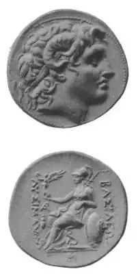 Tetradrachm of Lysimachus. The Greek inscription reads: ΒΑΣΙΛΕΩΣ ΛΥΣΙΜΑΧΟΥ "[coin] of King Lysimachus".